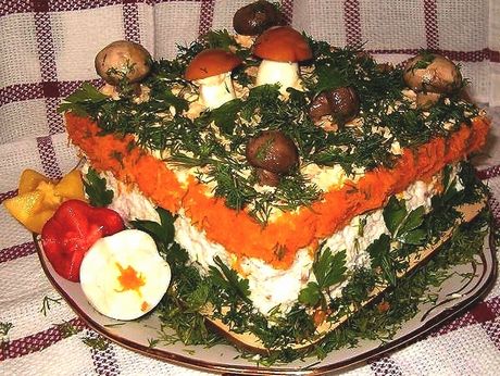 3) Подобно тому, как приготовляются слоеные бутерброды, делается и закусочный торт. Его делают круглой или квадратной формы и подают на стол не разрезая или нарезают только часть торта, чтобы не портился общий вид. Сверху закусочный торт украшают свежими овощами, маринованными грибами, раковыми шейками, красной икрой и другими продуктами. Такие торты рекомендуется делать небольших размеров.